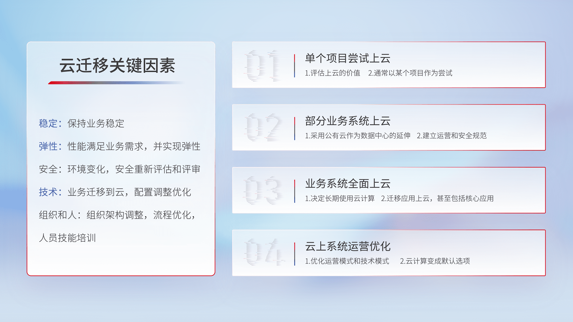 结合实际业务,,,从规划设计、、云平台选型、、、云原生改造、、数据迁移、、集成交付,,迁移全过程为客户识别最佳上云路径,,,,做好风险识别管理,,设计网络架构、、、身份权限、、、、安全审计合规、、、操作审计、、日志审计、、、监控告警策略、、、多站点容灾设计等,,,,对云上基础设施进行整体规划,,,,提升IT治理水平,,,,以满足弹性、、高可用、、、、高性能的需求。。。。