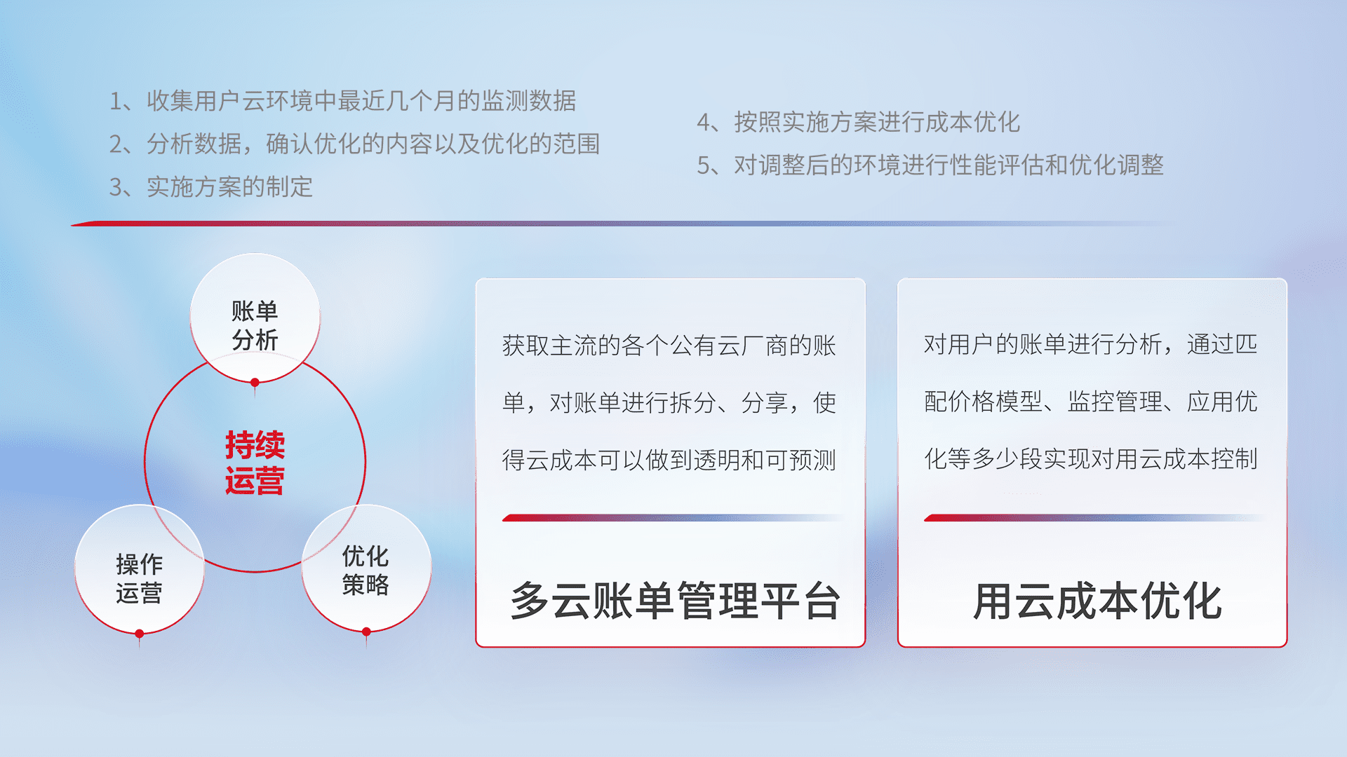 通过多云纳管,,,以统一的资源数据模型把客户的云资源进行抽象和封装,,,进而实现对多云资源的统一操作,,保障云资源管理的可靠性、、、、稳定性与可用性。。。。量身定制化运维内容,,配置、、、开发运维、、补丁管理、、、、备份、、、监控、、认证和访问管理、、审计和日常巡检等,,保障在用云过程中的可靠度,,稳定度以及高可用率。。