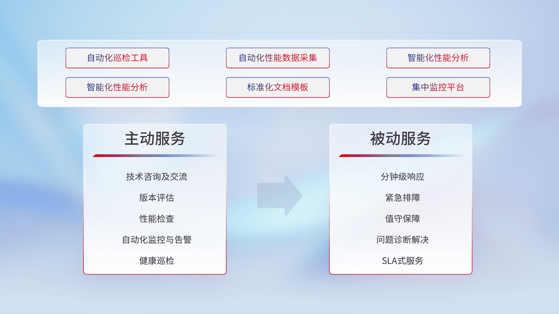 智能化工具和标准化文档,,,保障服务质量,,,,提供主动服务(包含技术咨询、、、版本评估、、性能检查、、自动化监控与告警、、、、健康巡检)和被动服务包含(分钟级响应、、、紧急排障、、、值守保障、、、、问题诊断解决、、、SLA服务)。。。。