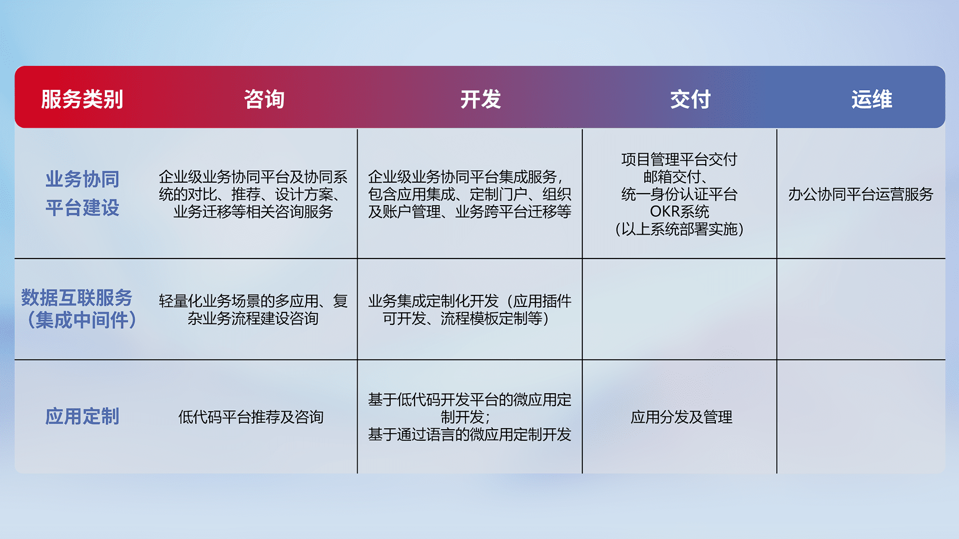 针对钉钉、、、、企微、、、、IDaas等平台级产品提供产品的规划、、、方案、、交付、、定制化开发等服务,,,实现如统一协同办公、、、、智能客户服务、、、混合会议管理、、、、智能数据查询、、、、等业务场景,,,,实现数字化转型。。